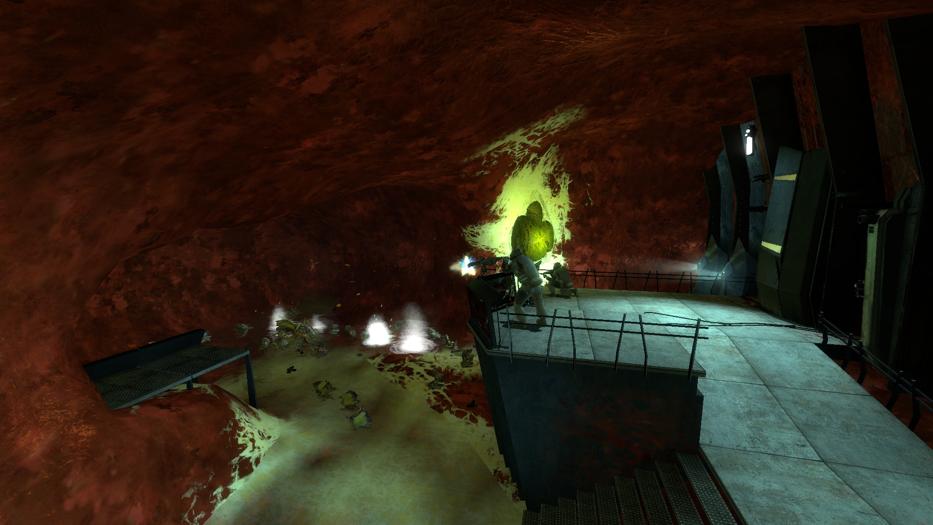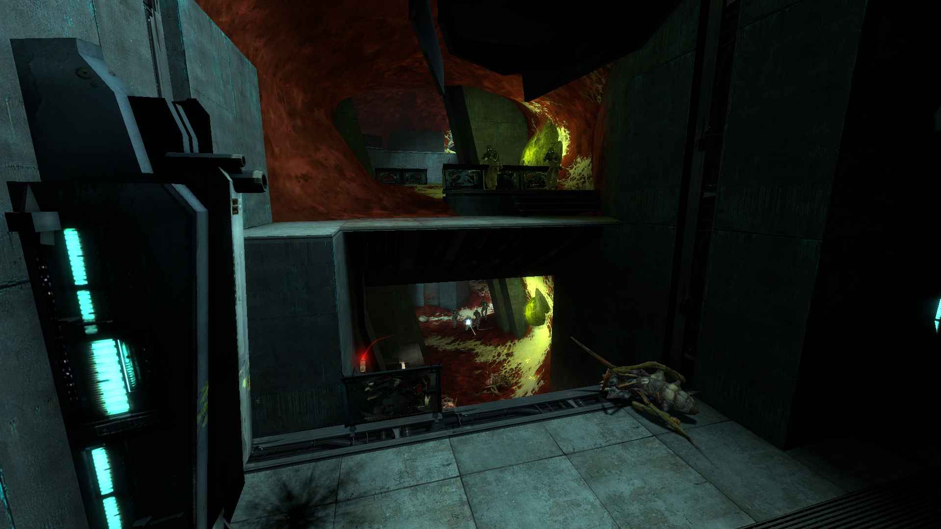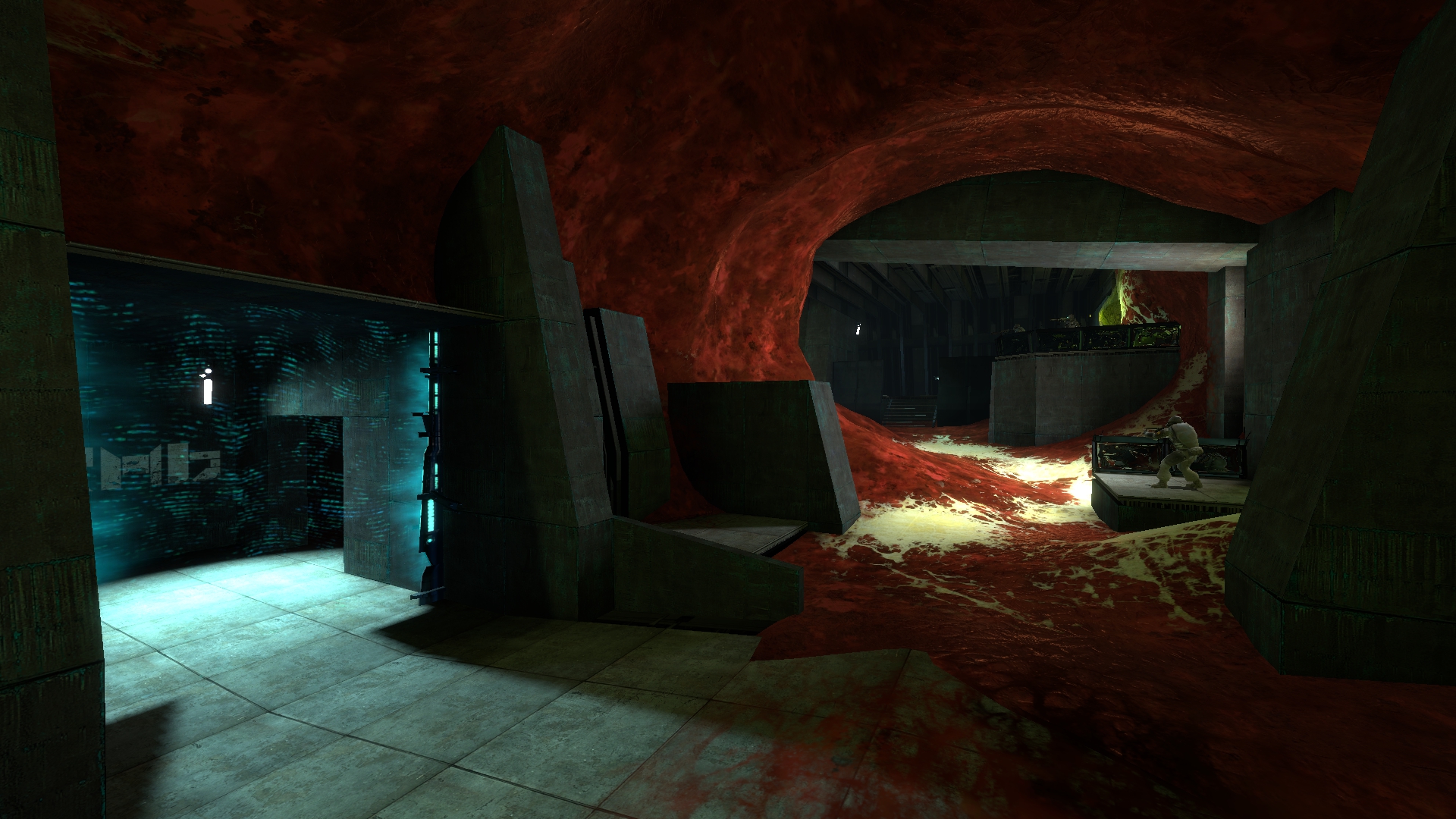 The Inside Job is a Half-Life 2 comedy-action map built on the premise that your beloved companion from the original game Barney Calhoun is very big, and you need to go inside him to fight off a deadly infection known as Combine's Disease. The map exists primarily to deliver jokes, but also features puzzle and combat gameplay in tight, semi-organic spaces.