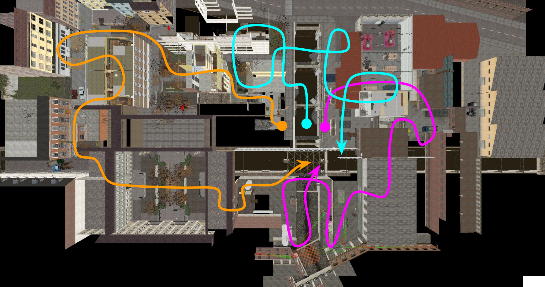 Orange: Rifle route, Cyan: Shotgun route, Purple: Crossbow route.