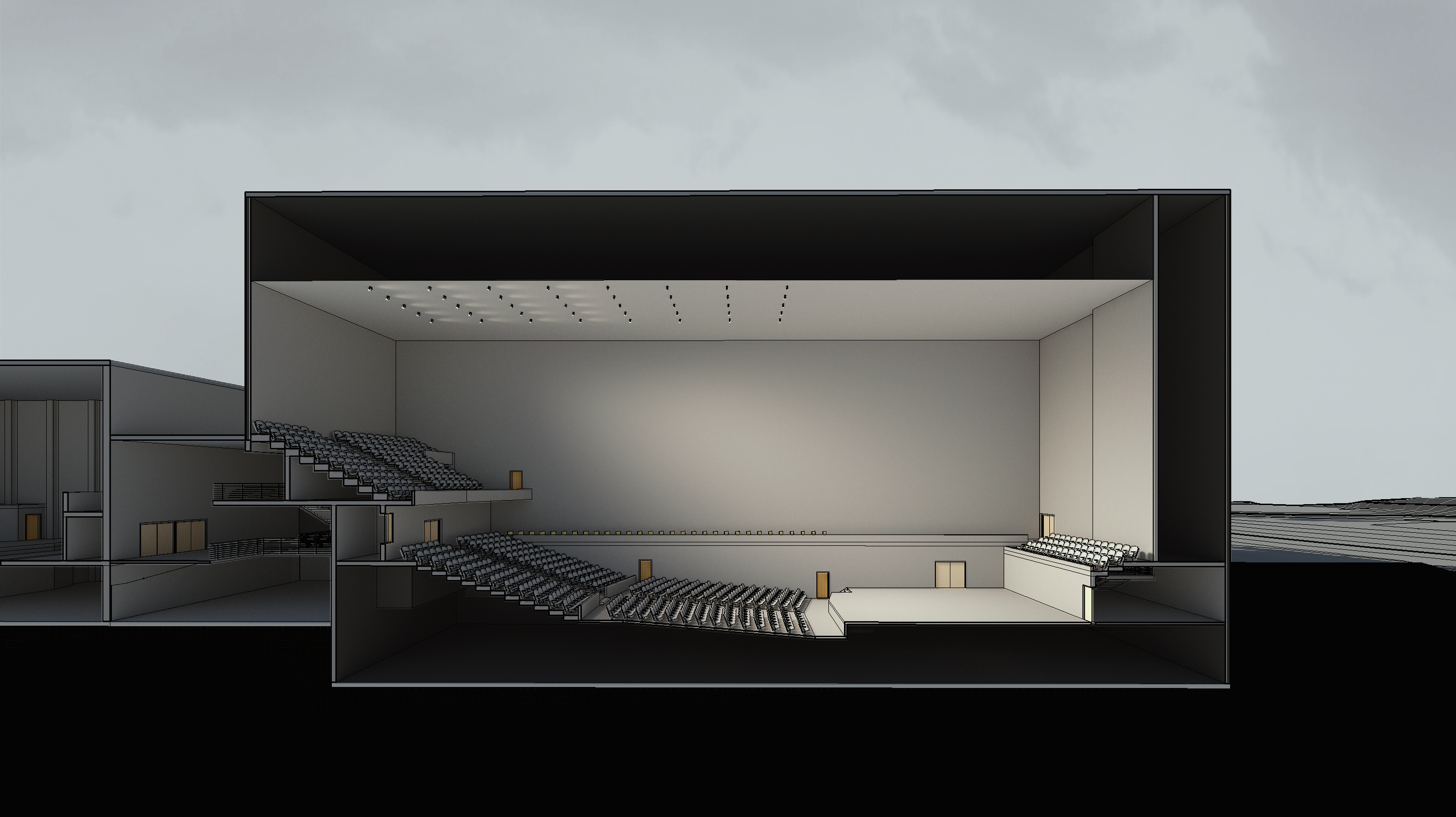 Perspective and section of the 1,000-seat orchestra hall. The audience enters and exits from three levels in order to maximize traffic flow. Fixed choir seating behind the stage can become audience seating when there is no choir.
