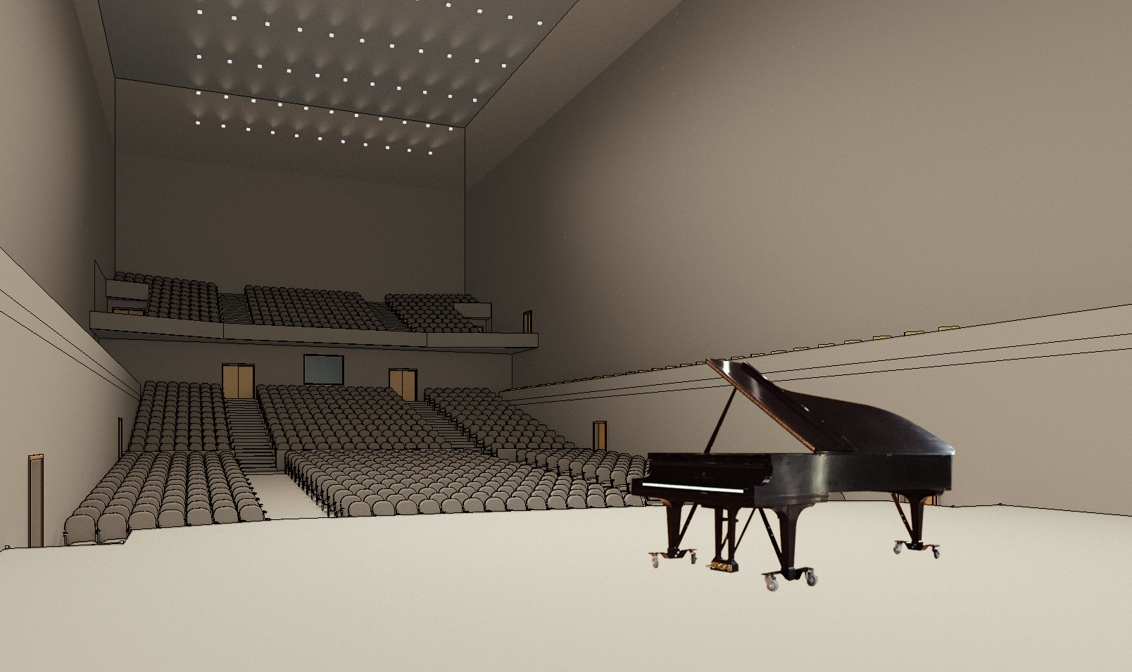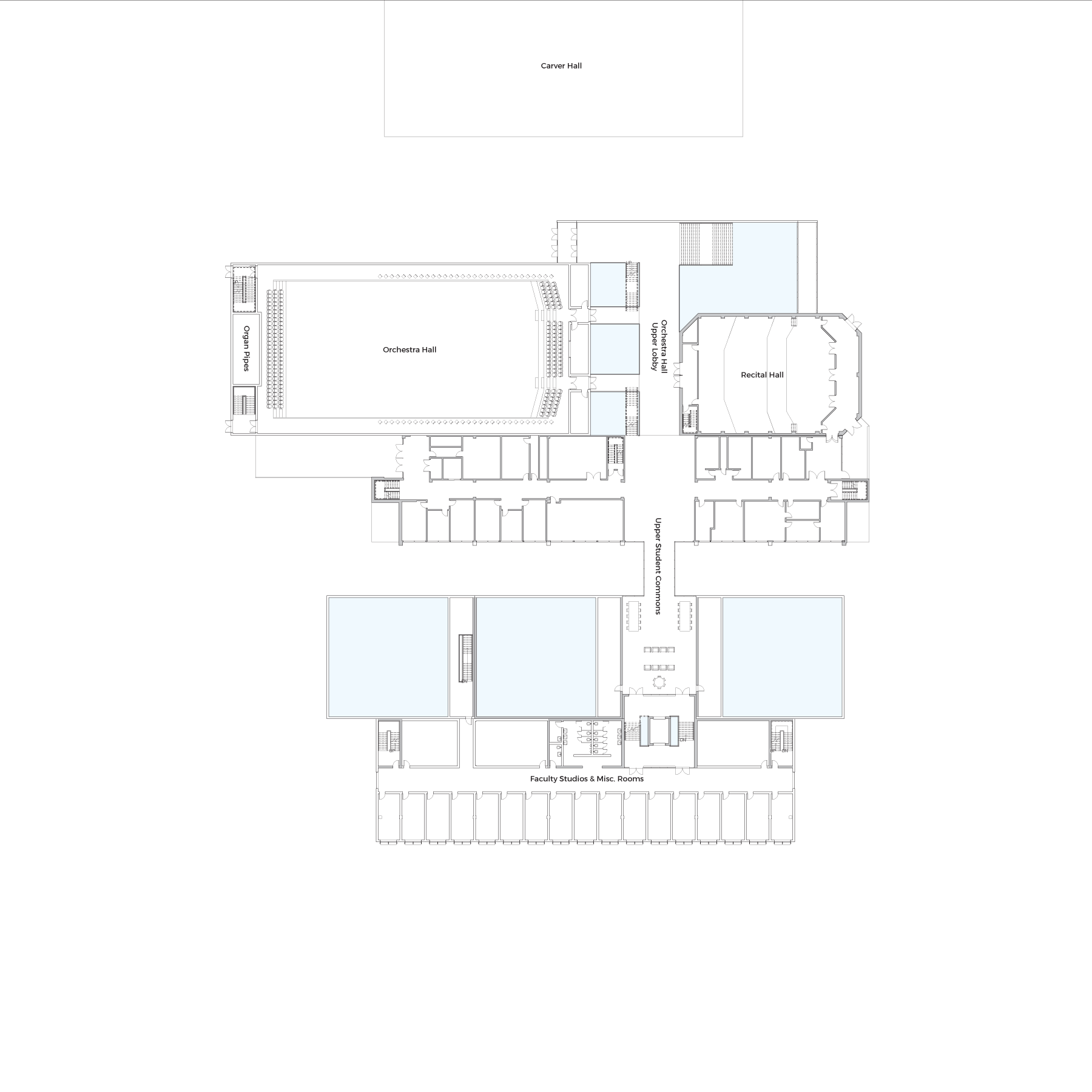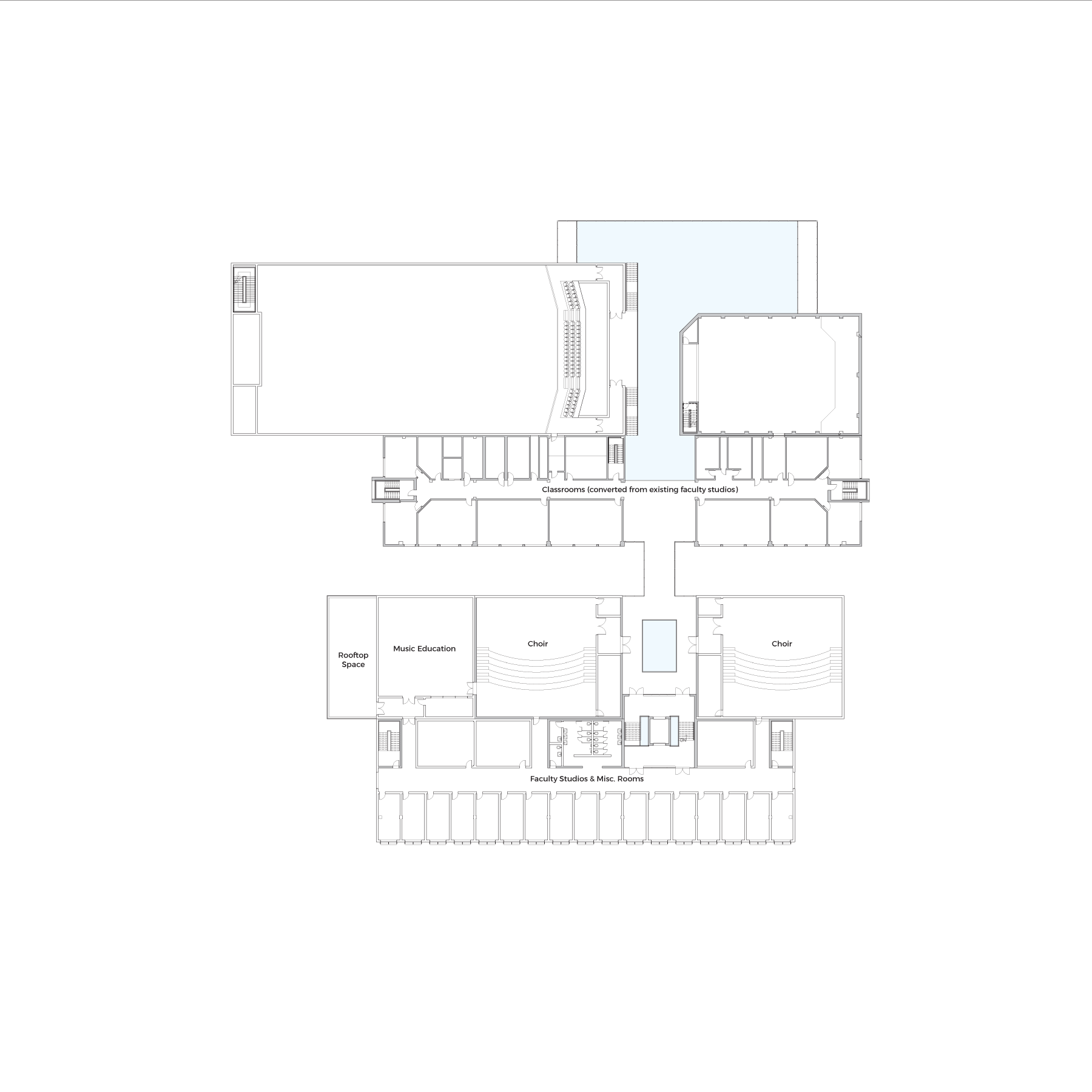 After interviewing the Music Department faculty on their needs (and by the guidance of their facilities director Lawrence Curry), it was determined early on that this addition would effectively double the square footage of the building: Four rehearsal spaces minimum, a 1,000-seat orchestra hall in addition to the existing recital hall, and additional classrooms, faculty offices, practice rooms, and storage. Also requested were spaces for a potentially expanded music education program, as well as a performance space for experimental electronic music.