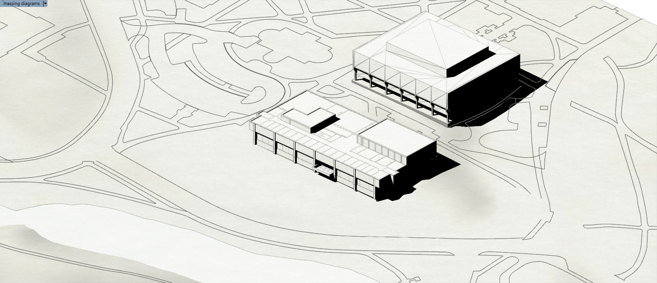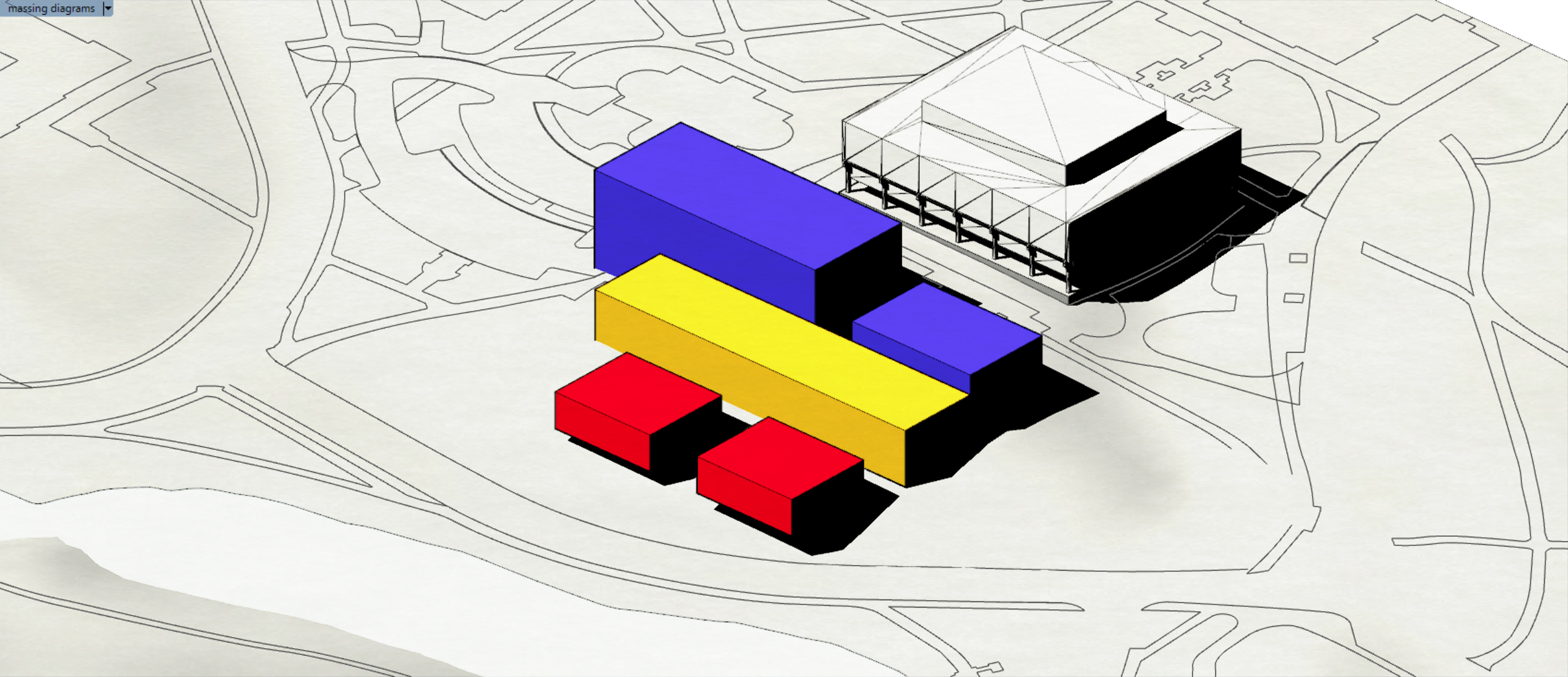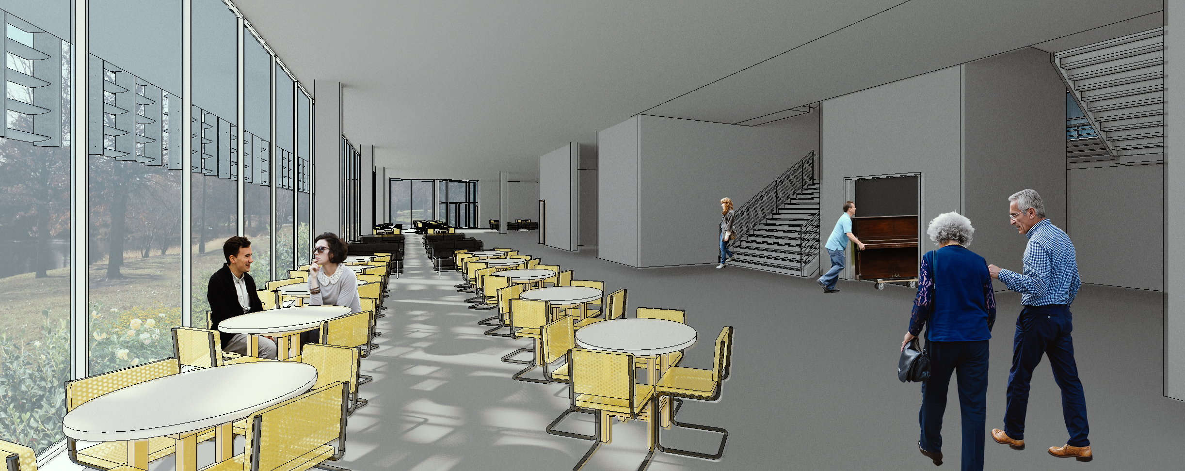 After interviewing the Music Department faculty on their needs (and by the guidance of their facilities director Lawrence Curry), it was determined early on that this addition would effectively double the square footage of the building: Four rehearsal spaces minimum, a 1,000-seat orchestra hall in addition to the existing recital hall, and additional classrooms, faculty offices, practice rooms, and storage. Also requested were spaces for a potentially expanded music education program, as well as a performance space for experimental electronic music.