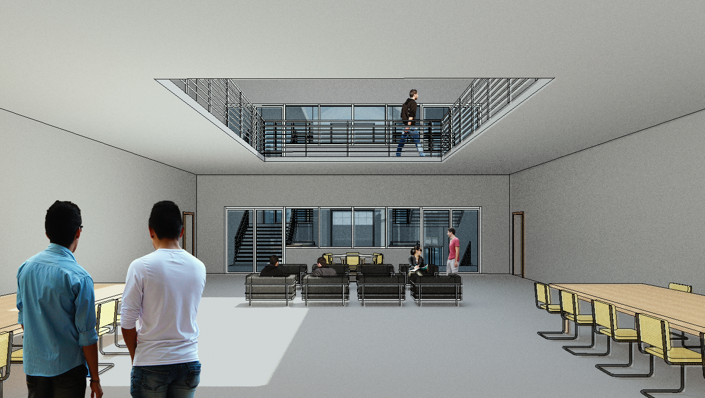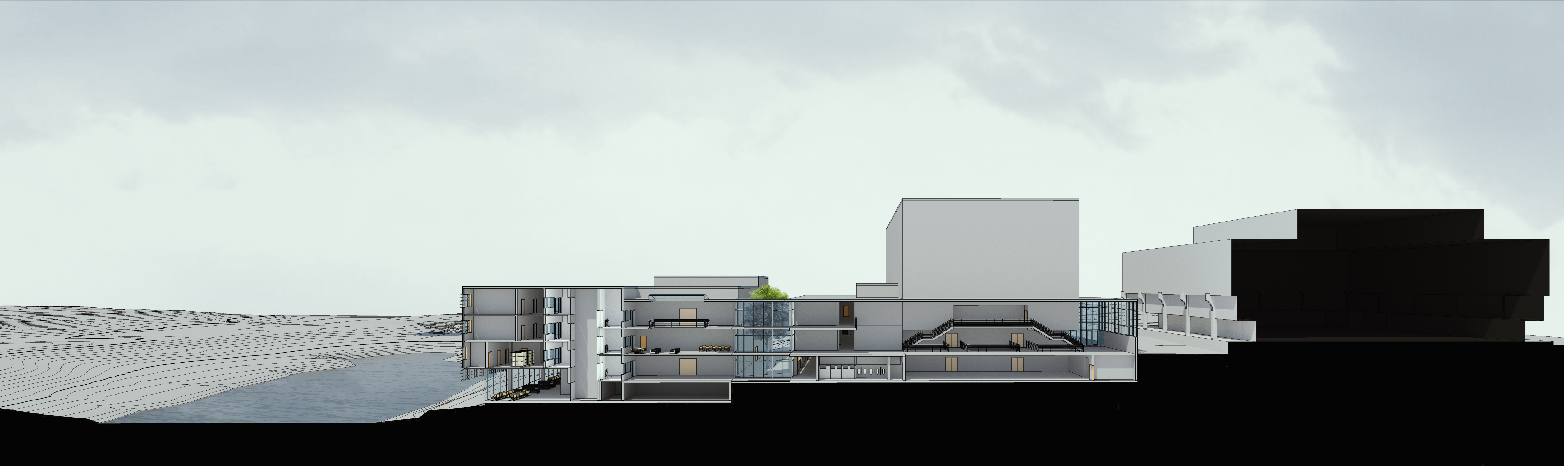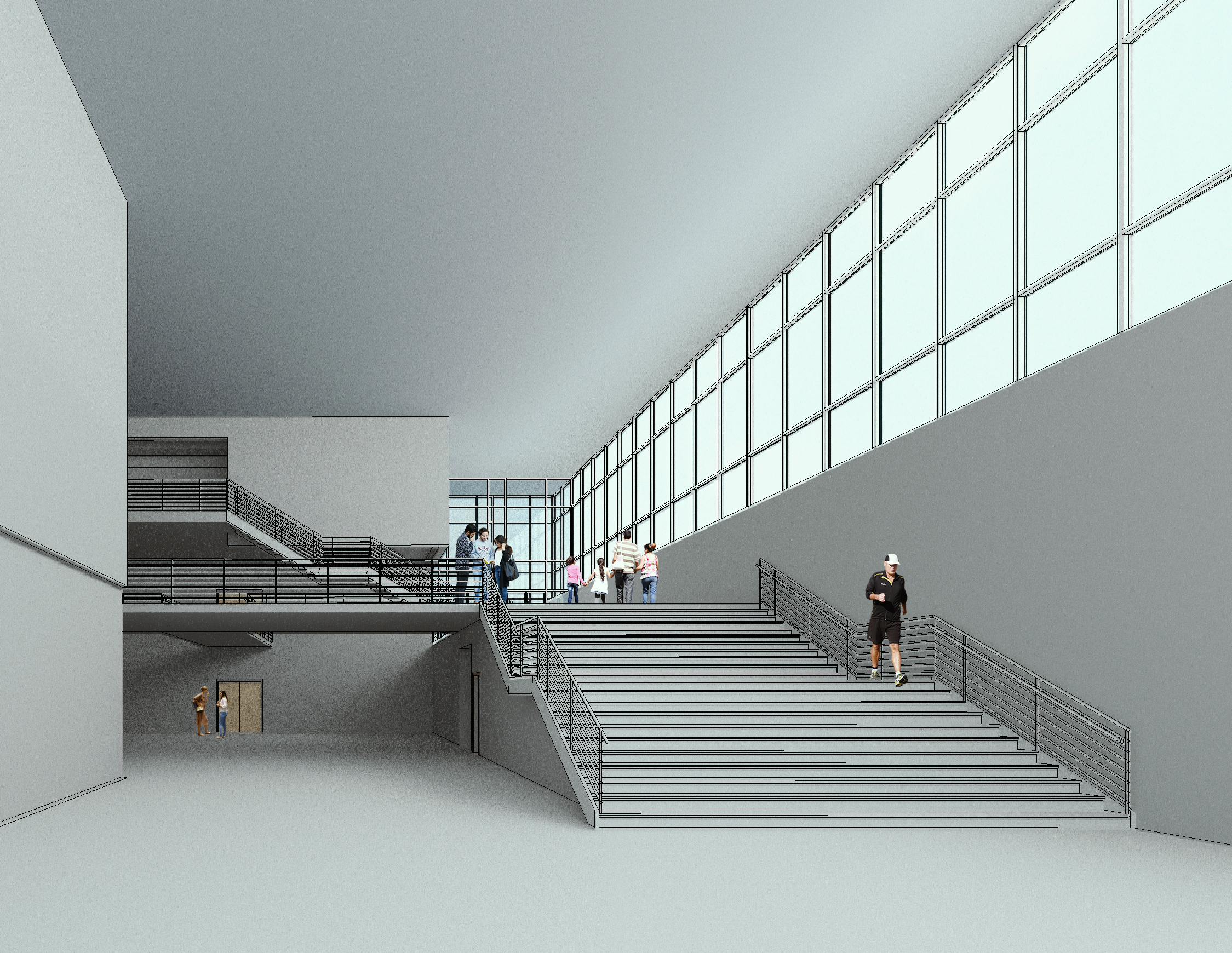 Perspective and section of a new student common area, which is located to join all four rehearsal spaces together. Music technology and education spaces are also shown in this section to the right, matching the massing diagram from before.