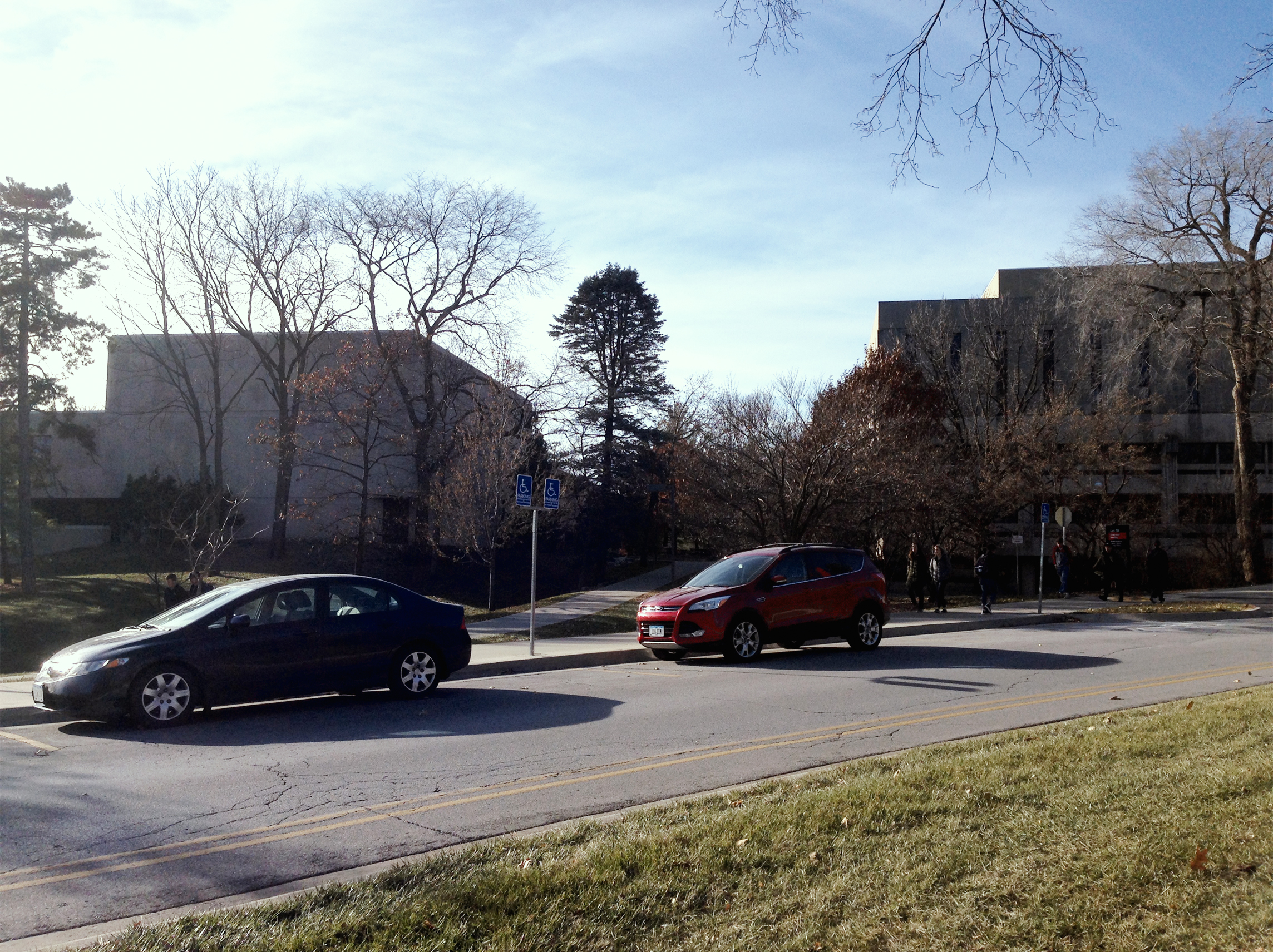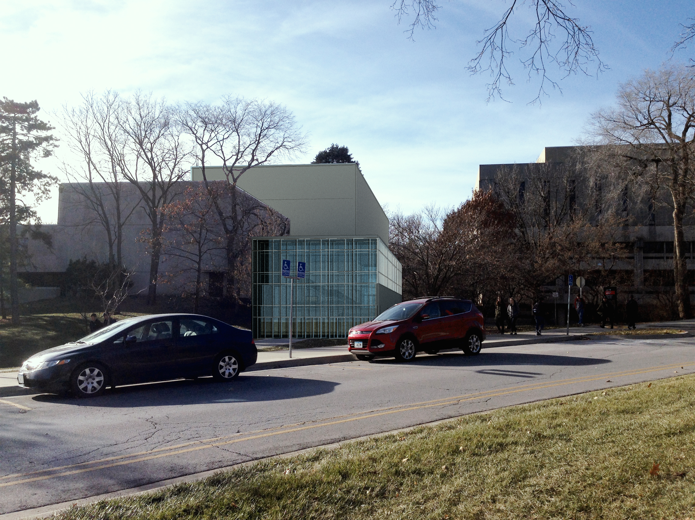 The new 1,000-seat orchestra hall goes in this spot, allowing both performance spaces share the benefits of a new lobby. This new lobby also helps with visibility of the building, with the main entrance becoming more immediately obvious as well as reachable by automobile (which it previously was not). The new lobby also acts as a public way, replacing a long slope of sidewalk (which was dangerous when icy in Iowa's long winters) with an interior set of stairs.
