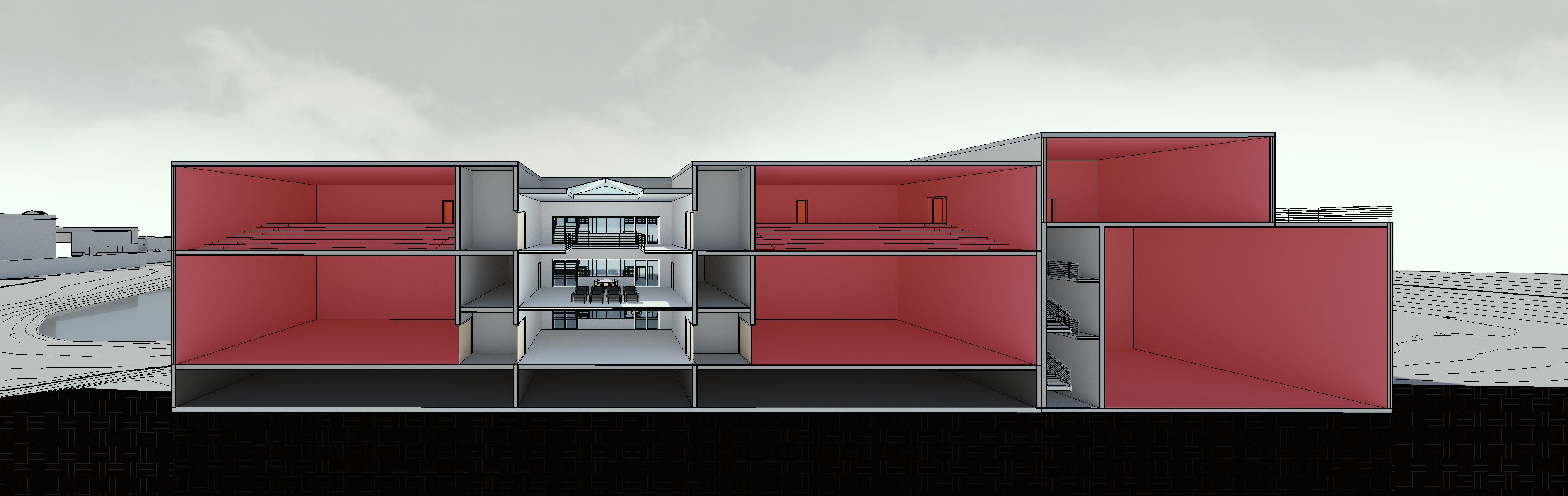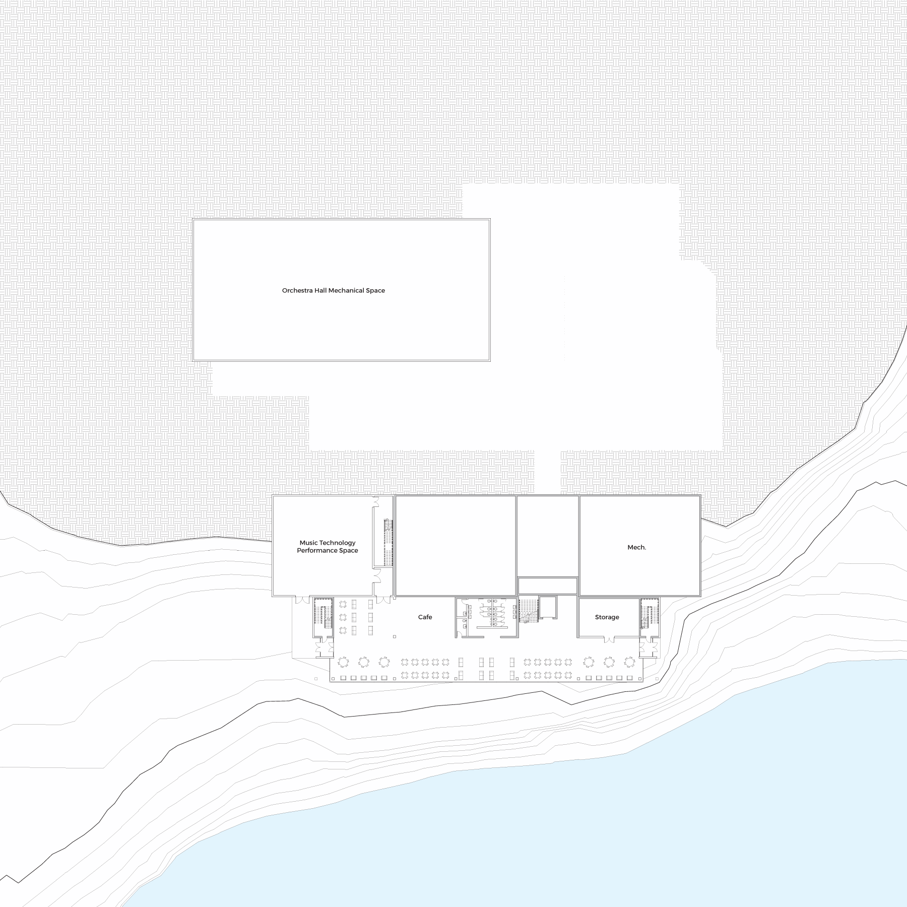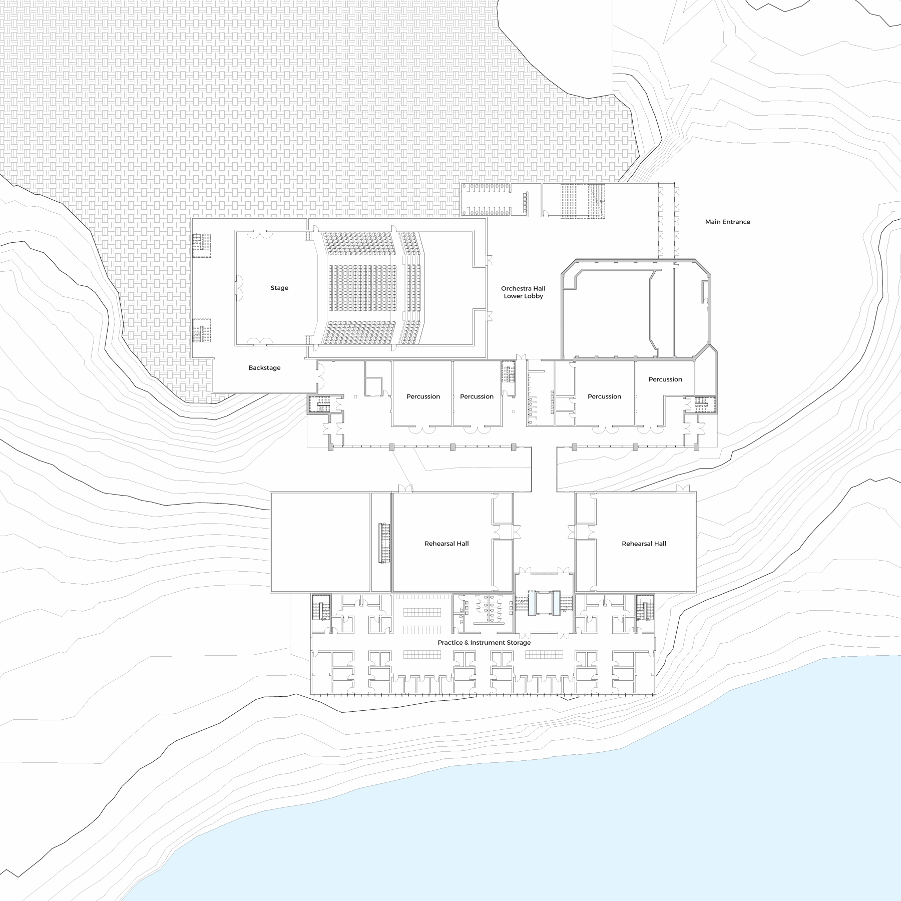 The number of rehearsal spaces is then doubled. Lower rehearsal spaces for band and orchestra are at-level with the backstage of the orchestra hall, ensuring the movement of percussion equipment is as easy as possible. Upper rehearsal spaces are for choir. Two additional spaces of the same size are added to the west, the lower for electronic music and the upper for music education.