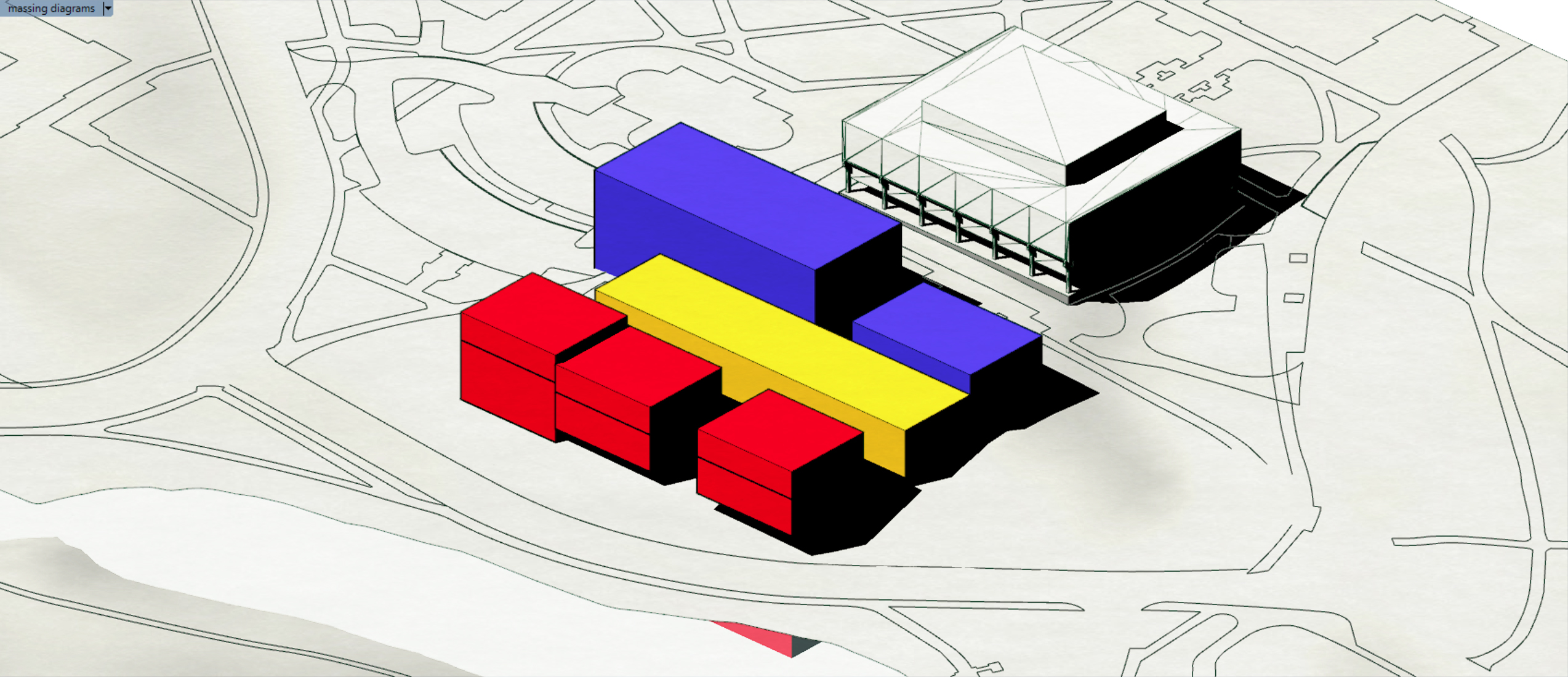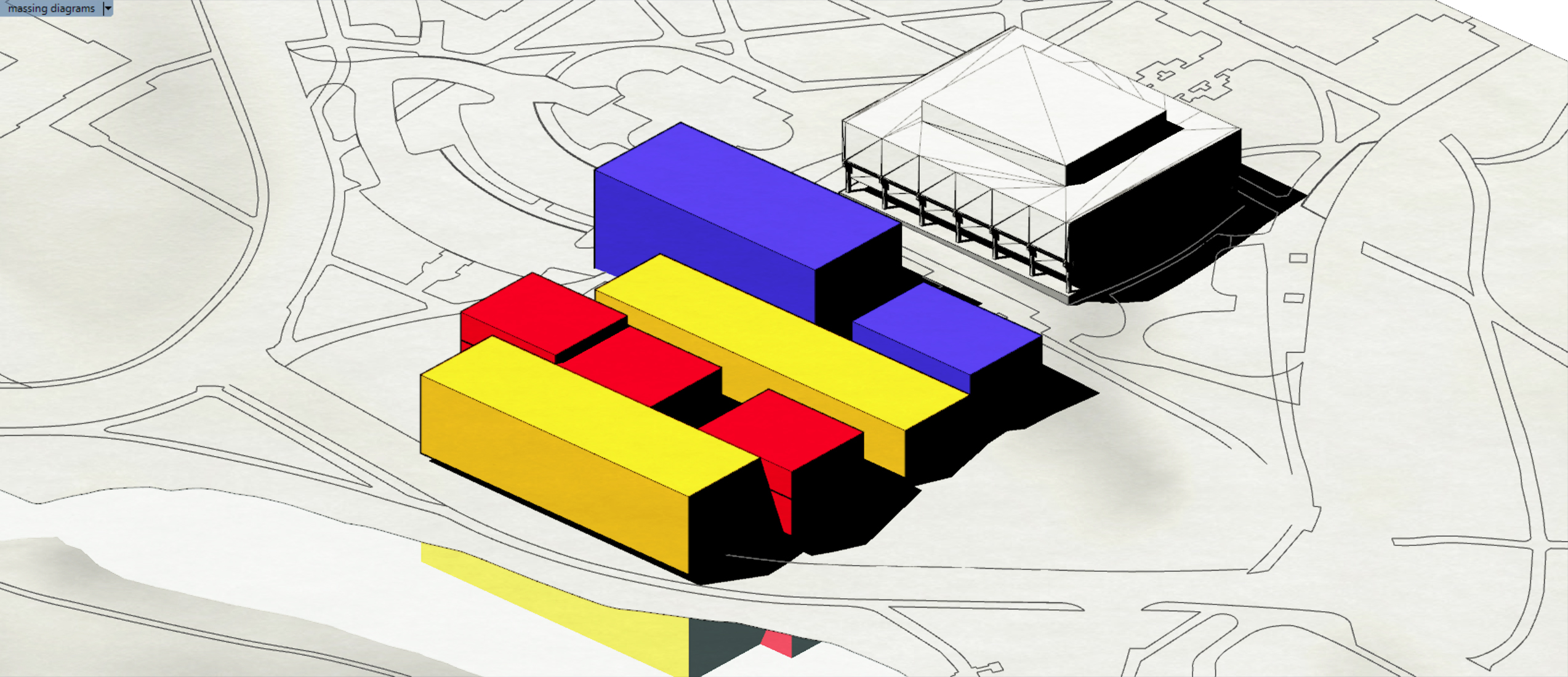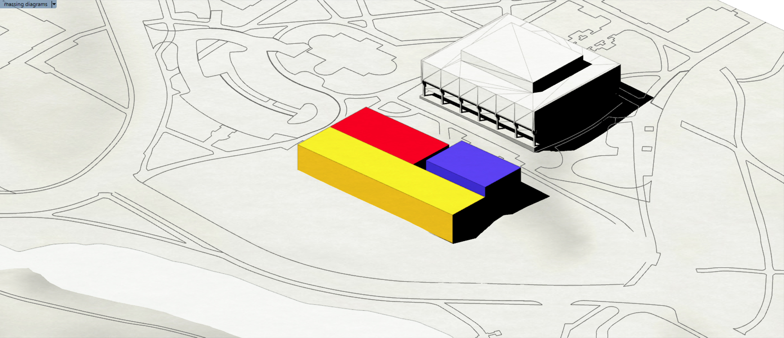 The existing building is divided into three main programs: Practice, rehearsal, and performance. This division is quite literal, with each set of rooms built on a separate foundation for acoustic isolation. Yellow is practice, red is rehearsal, and blue is performance.