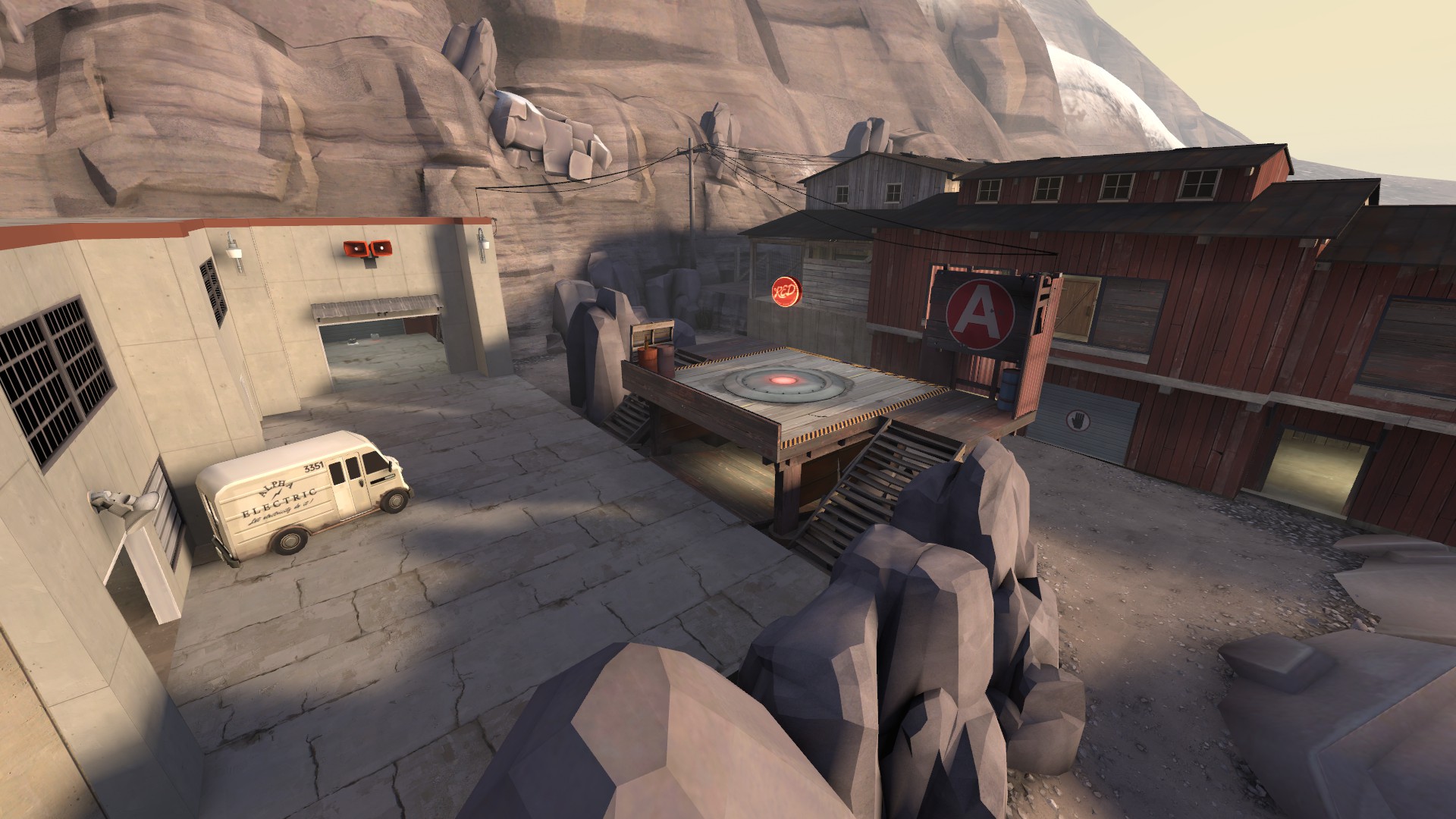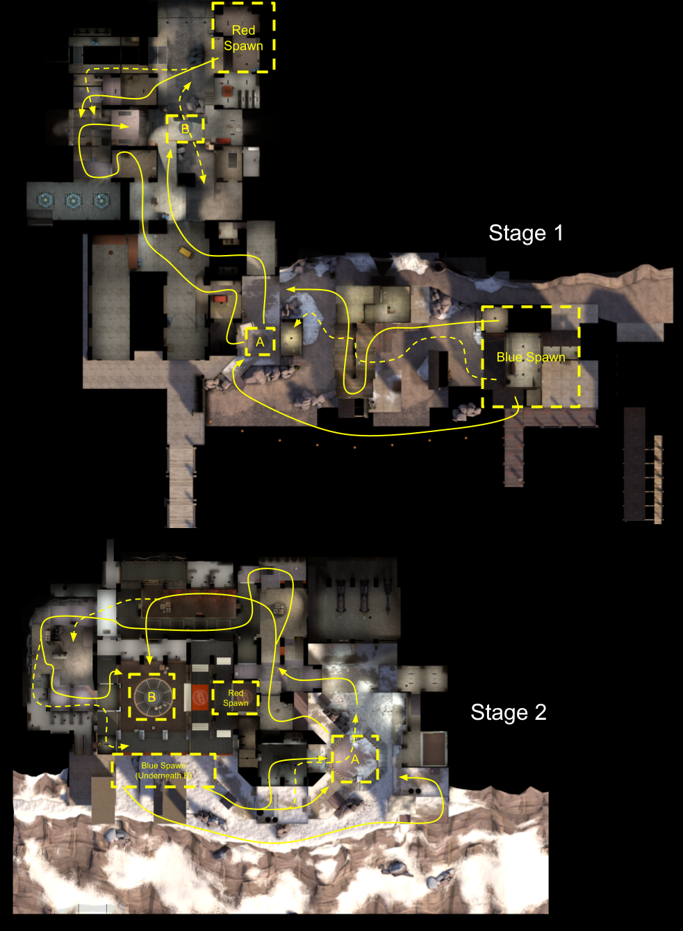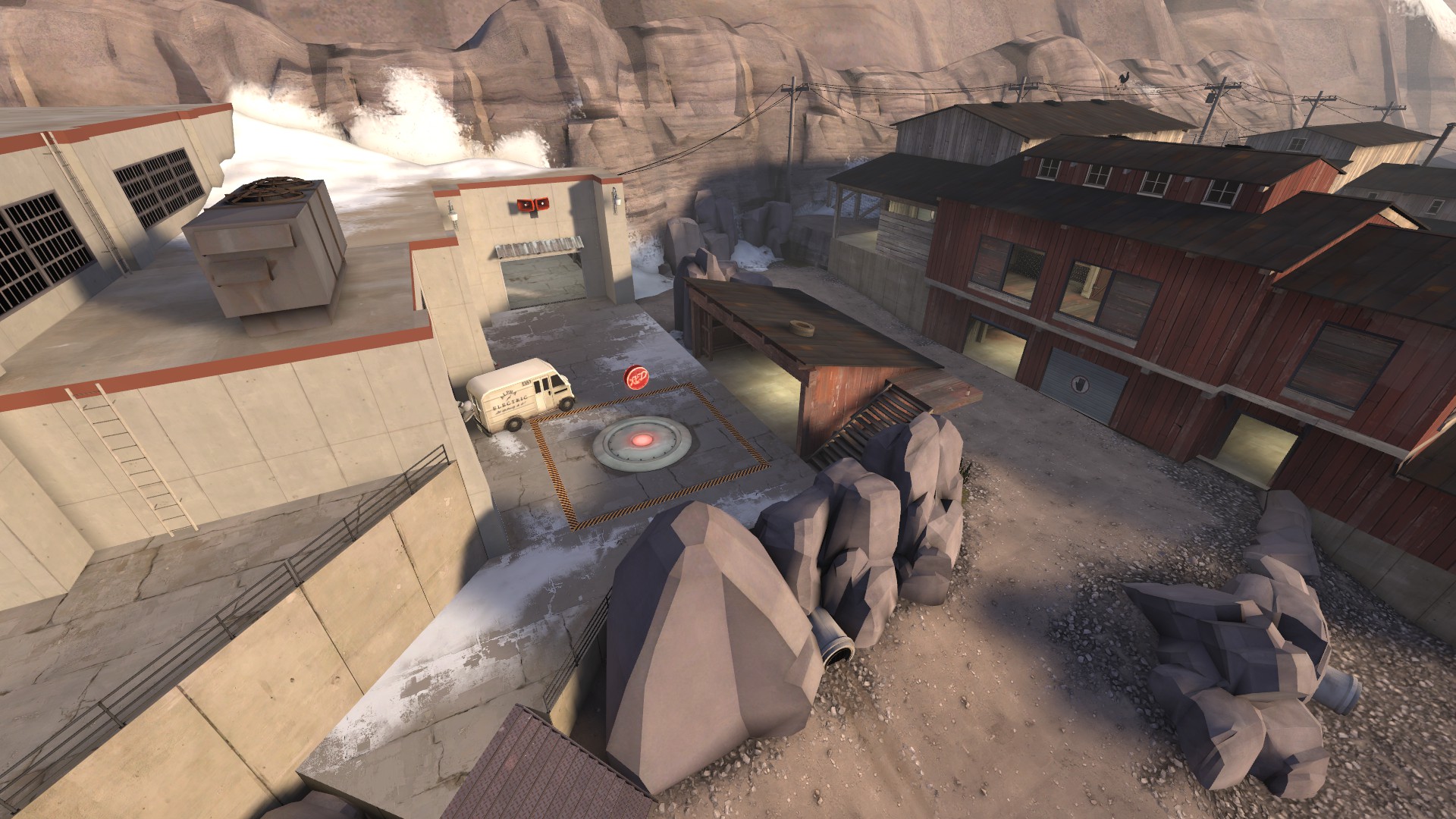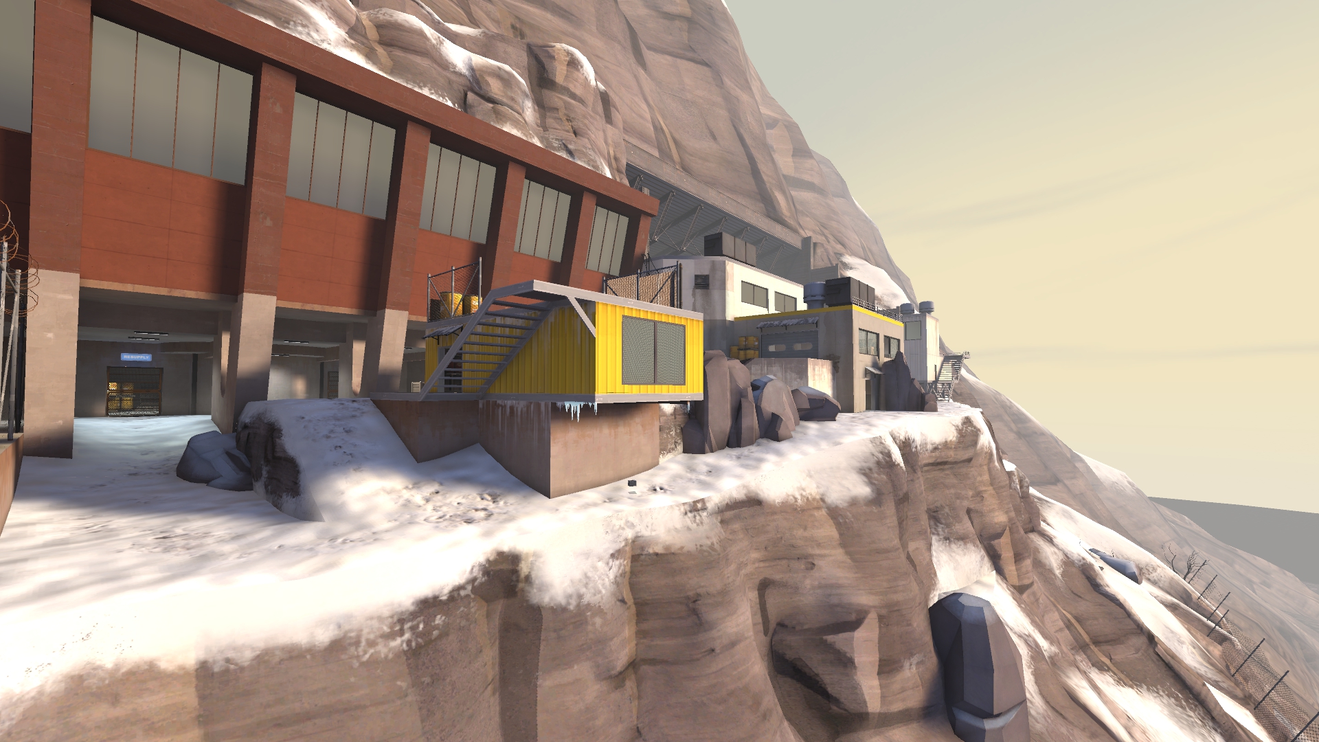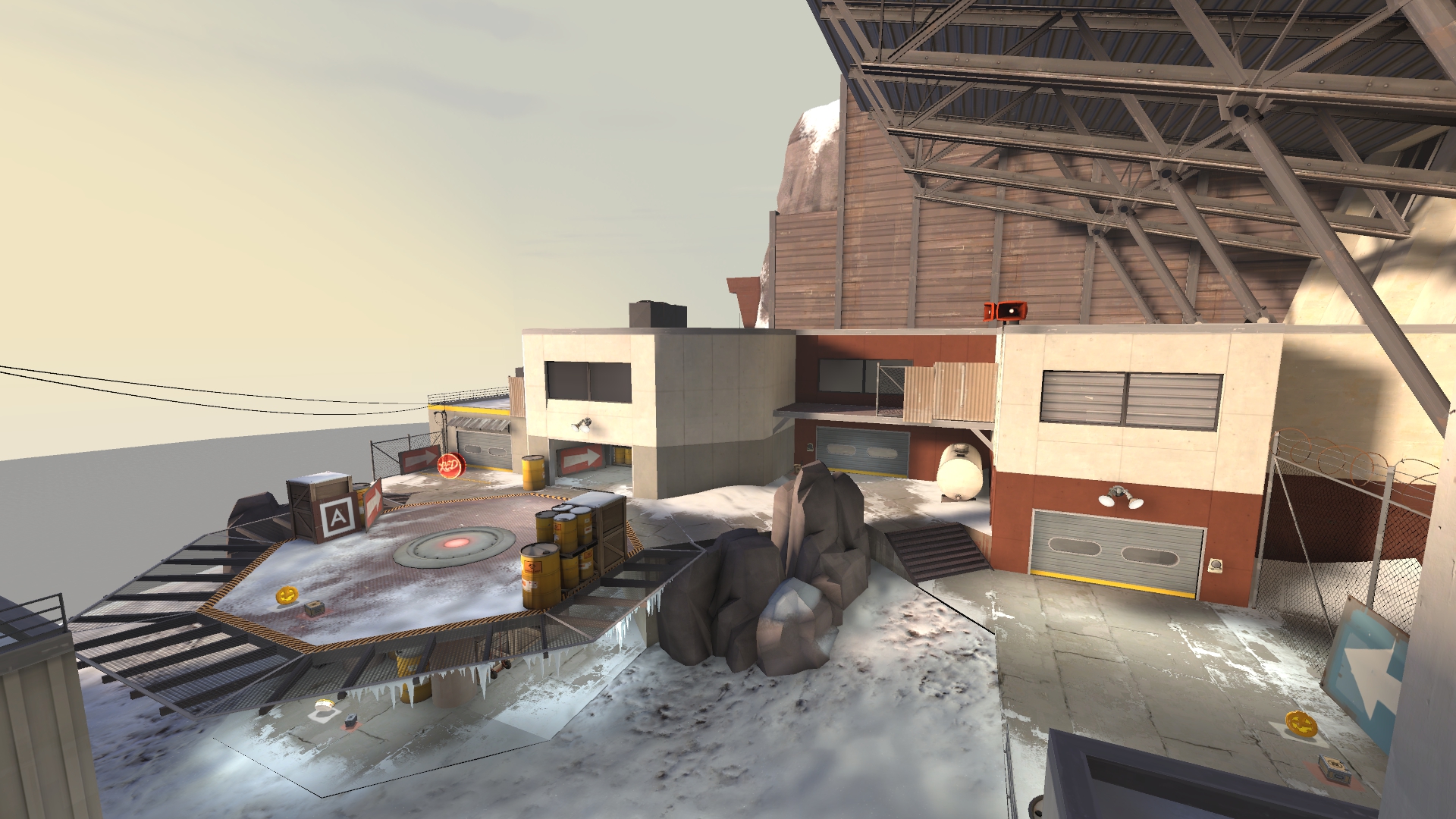 The first point of the first stage was originally a raised platform with a passage underneath. This design proved to be a bit awkward with regards to sightline management and providing obvious locations for engineer sentry placement, so it was replaced with a shed that provides an obvious anchor for defense and better controls sightlines. Both teams can easily access the roof of the shed via stairs or a mound of snow (hidden behind shed in image), which functions as a highly exposed yet very powerful area to control.