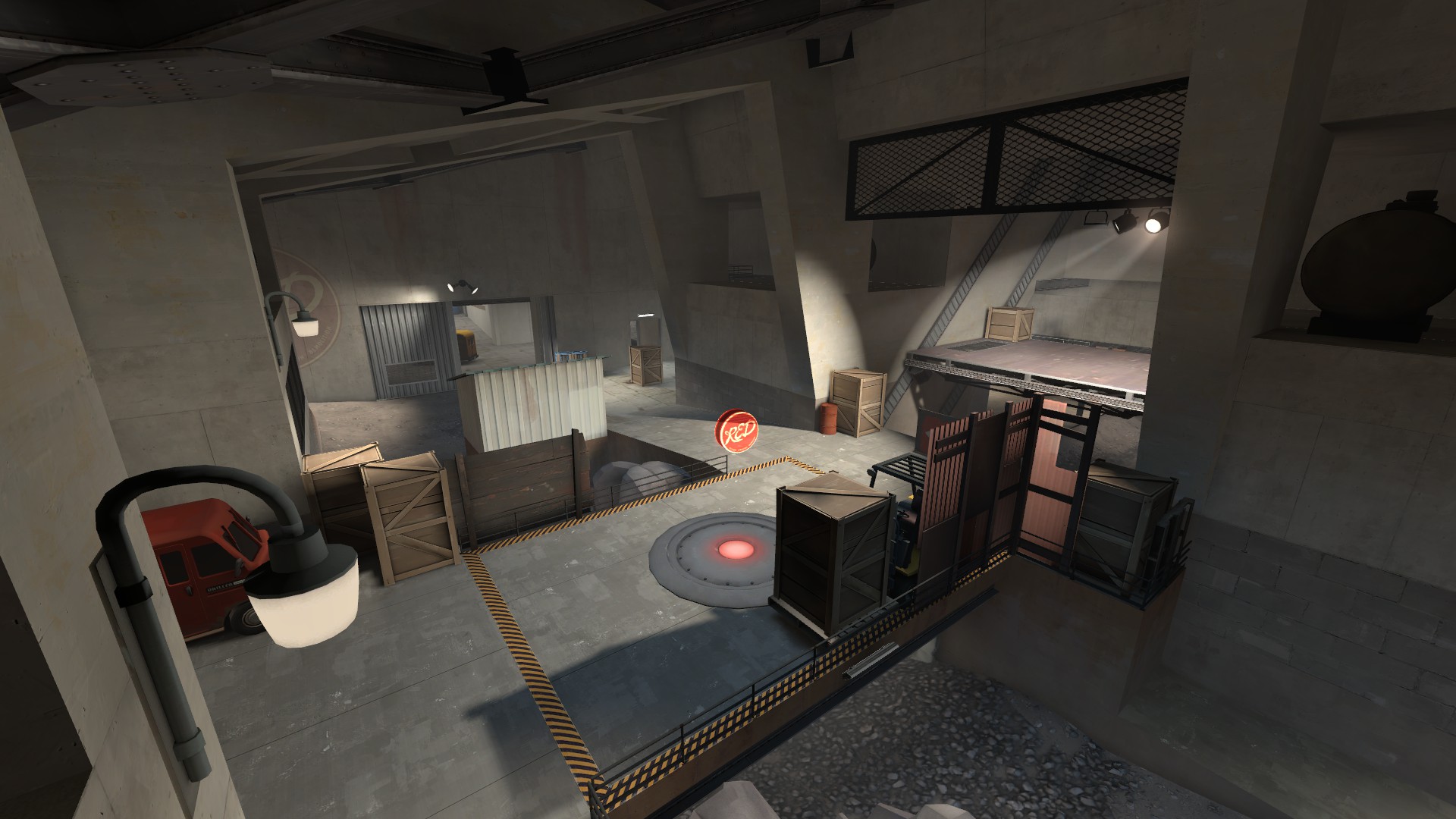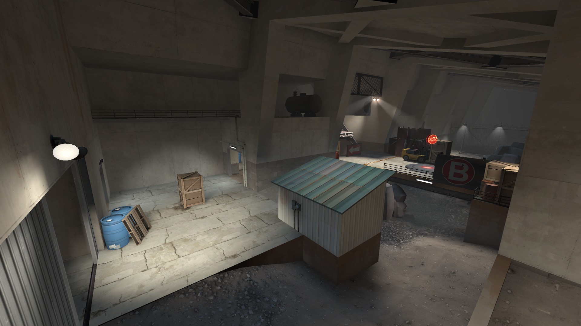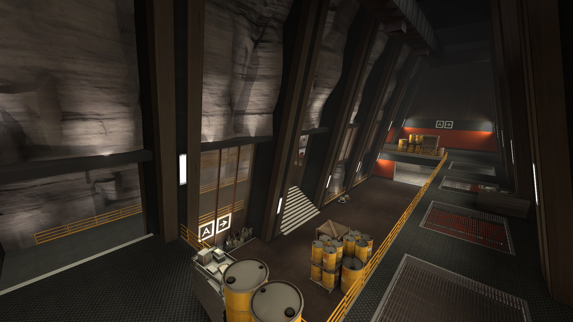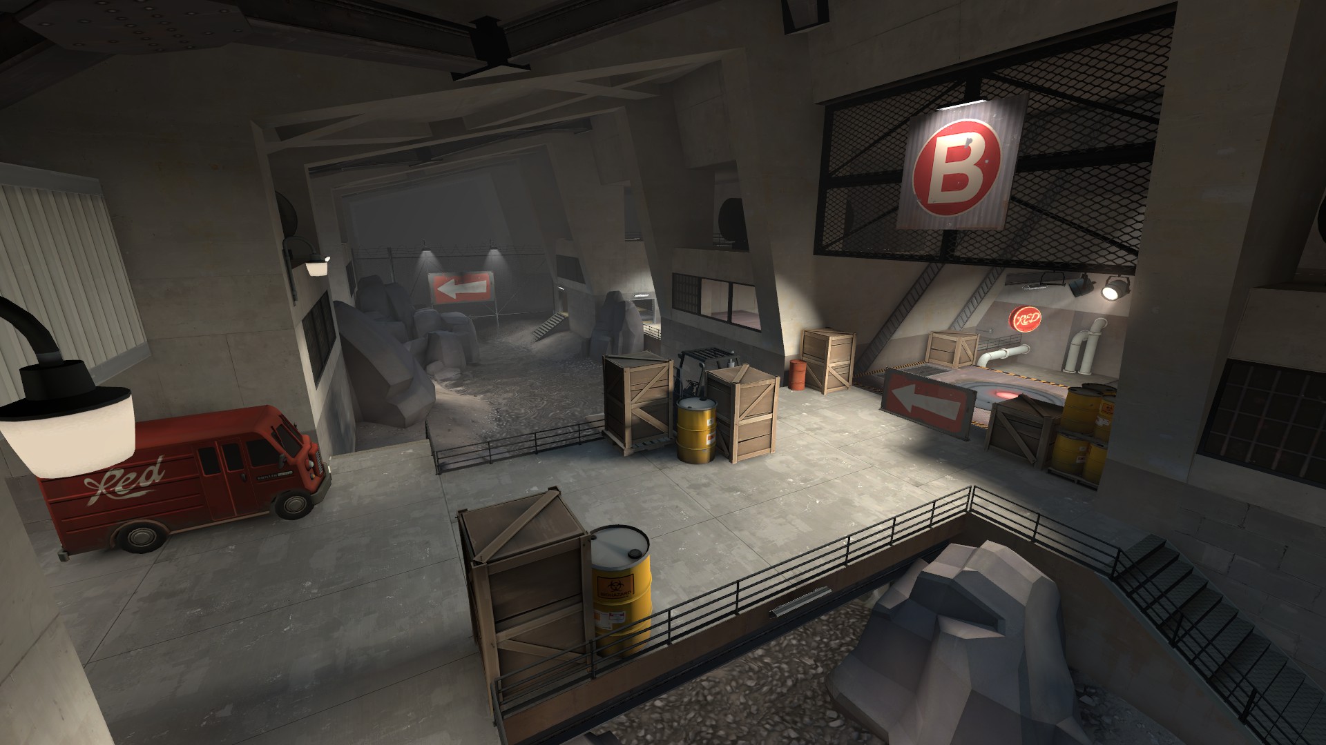 In older versions of the map, a tight flank was provided for the attacking team to access far ends of the main room, but that tightness made it very hard to push against a competent defense, and the layout had no room for expansion. The entire final room was mirrored to give the flank more room to breathe, and to make it so a defensive push through the flank would not exit behind where the attacking team tends to gather for pushing the point.