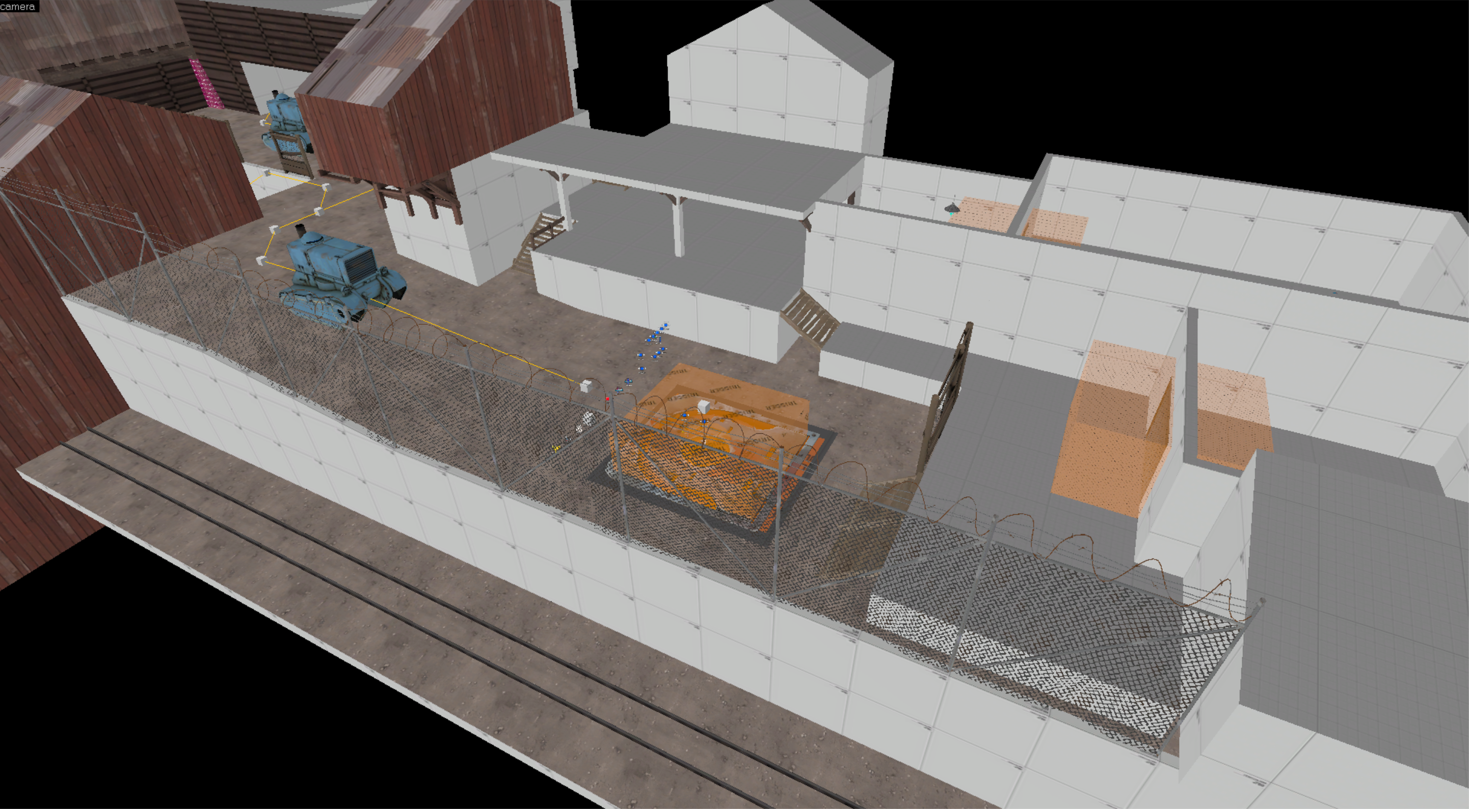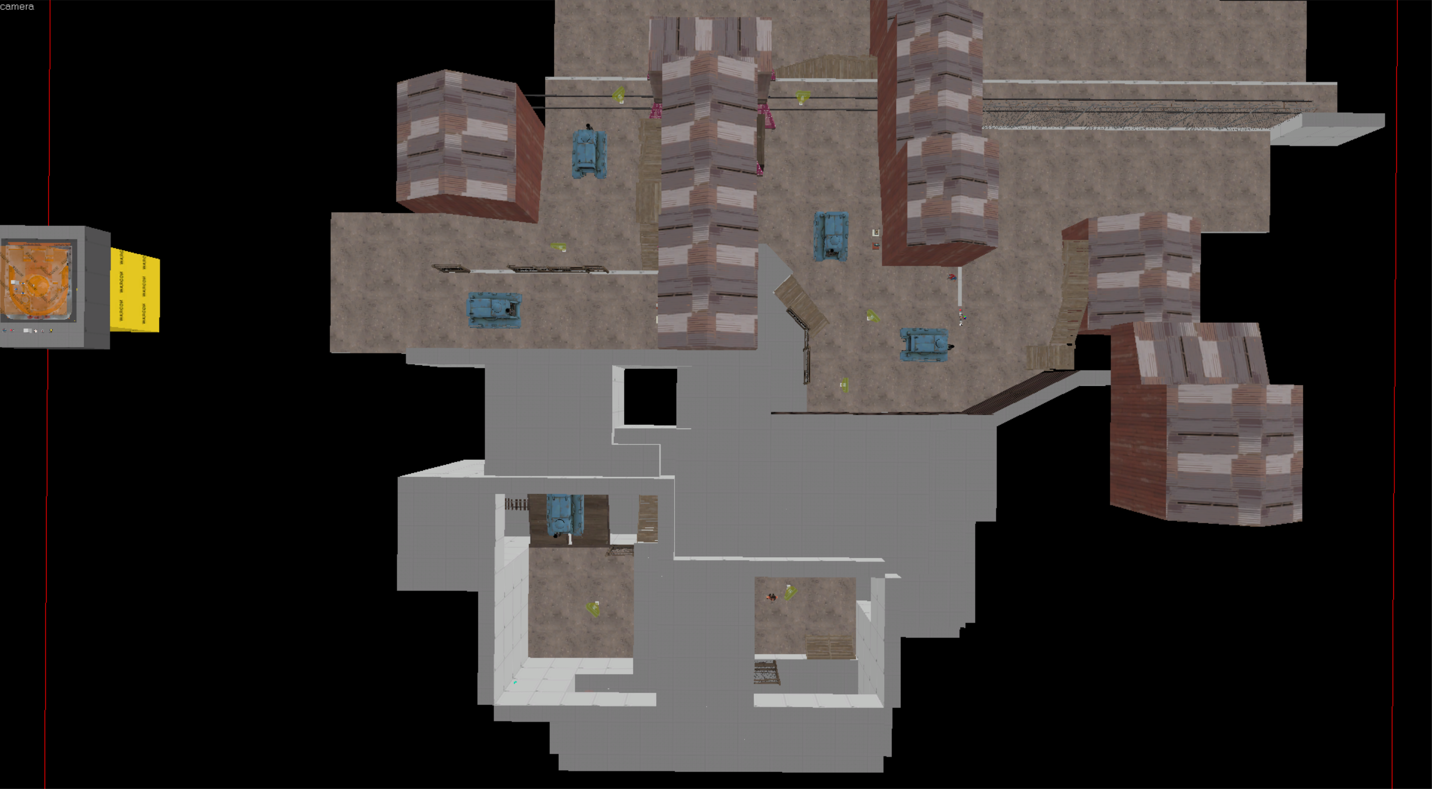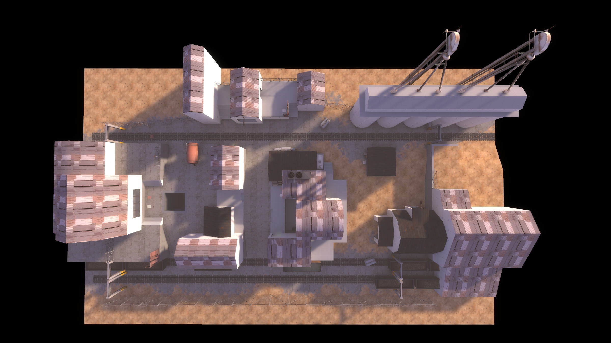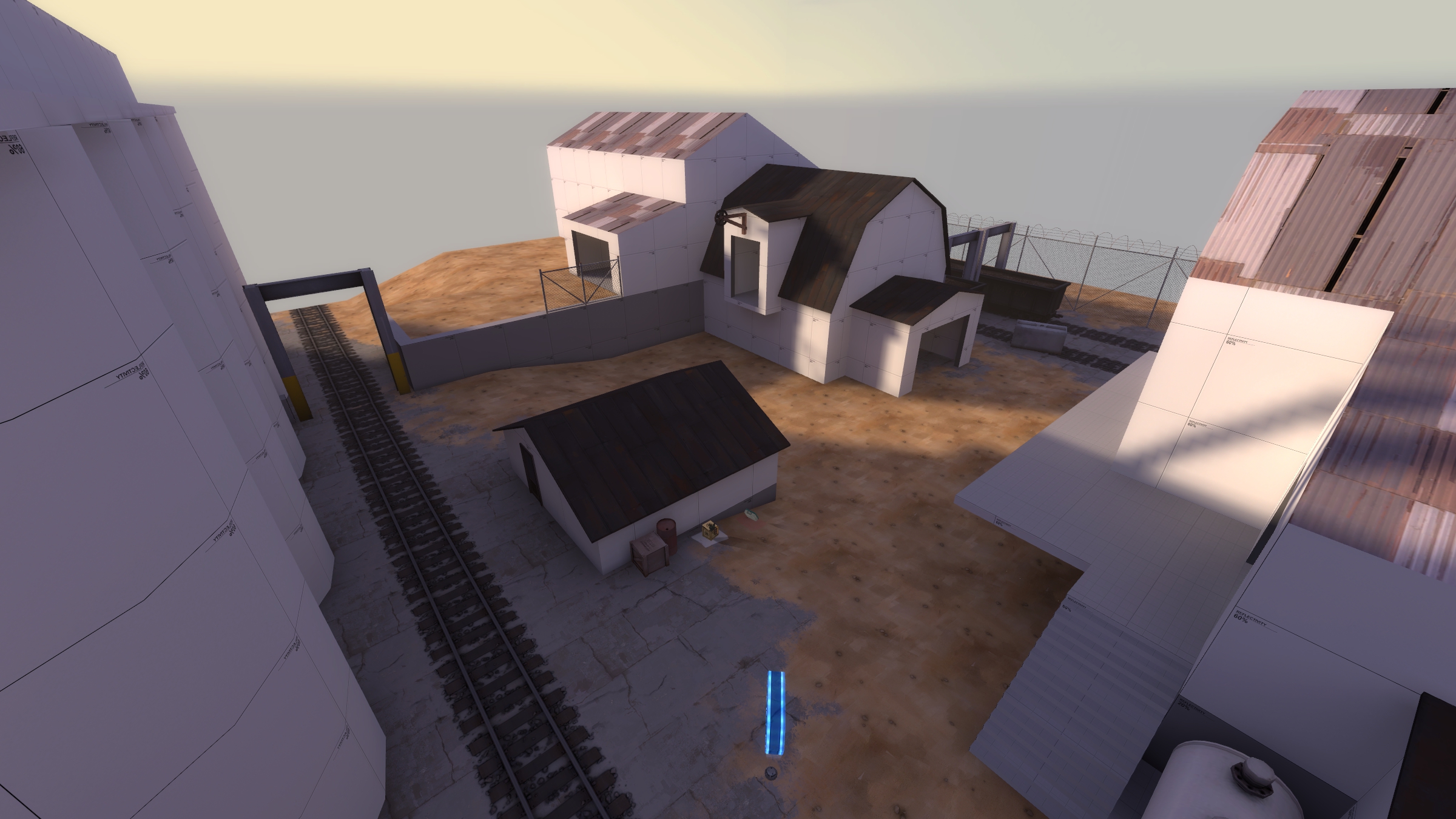 After testing and iterating this layout a few times, I realized I had made some mistakes in the overall layout. The central group of buildings was far more complicated than it needed to be (and could only really be simplified by shrinking the map, which was already relatively small), and the central road where robots crossed was difficult to design around, since bots could be walking in either direction. It wasn't very much fun to fight robots as they turned the corner towards the hatch. Lastly, it was difficult to iterate on the design because I had designed it without any negative space in the layout, meaning changing any piece of the middle of the map would effect everything around it. Train tracks on either side also made the layout less flexible to work with.