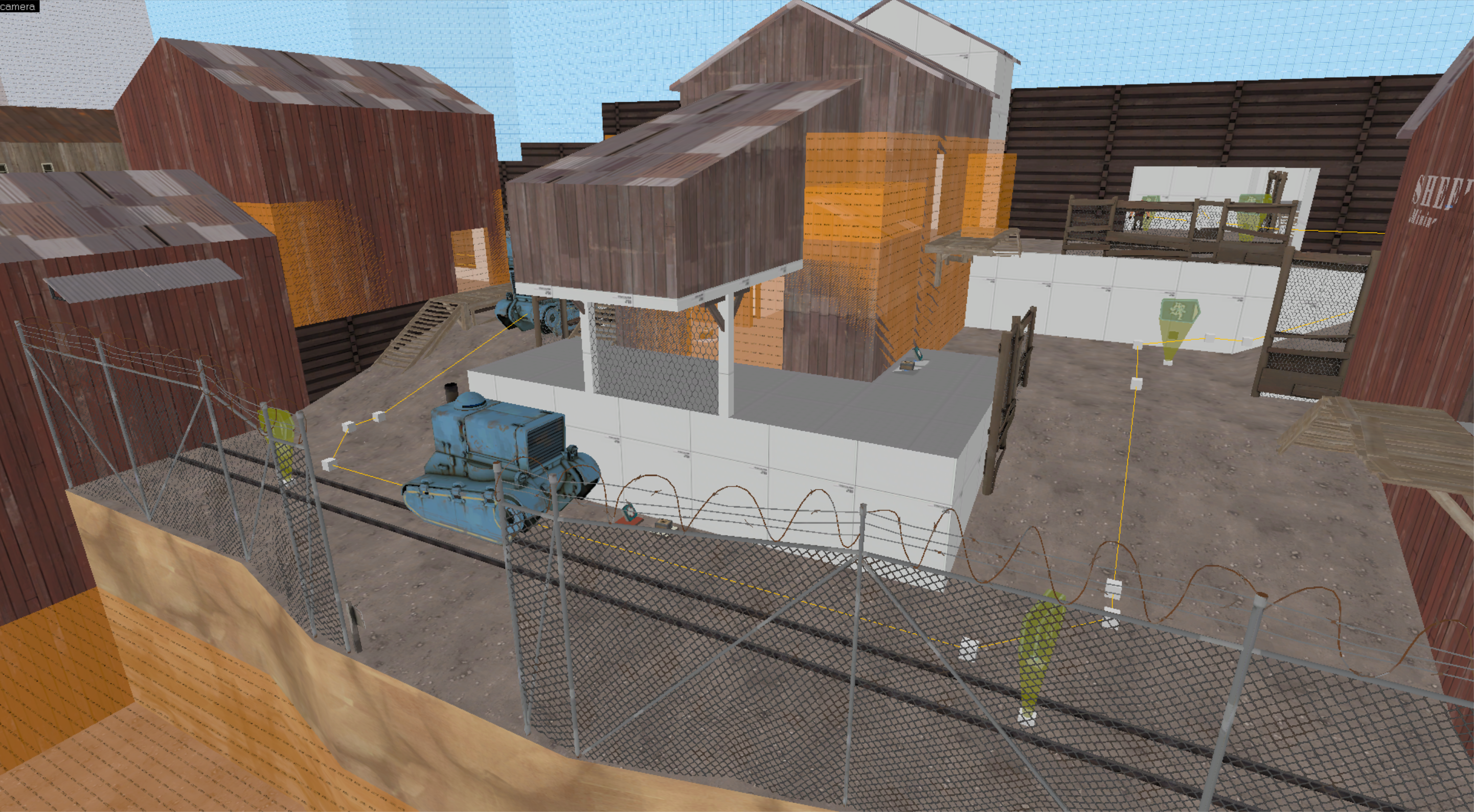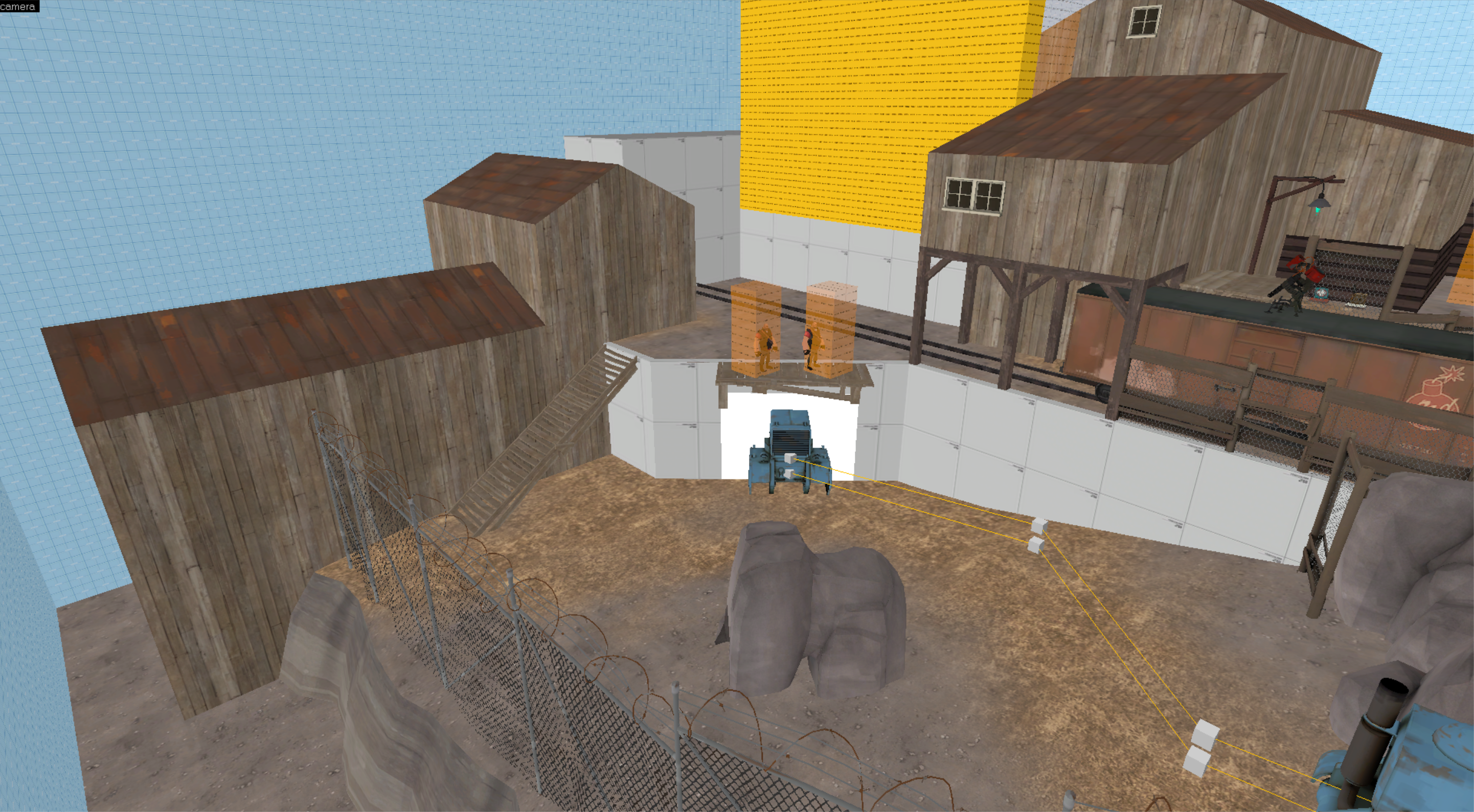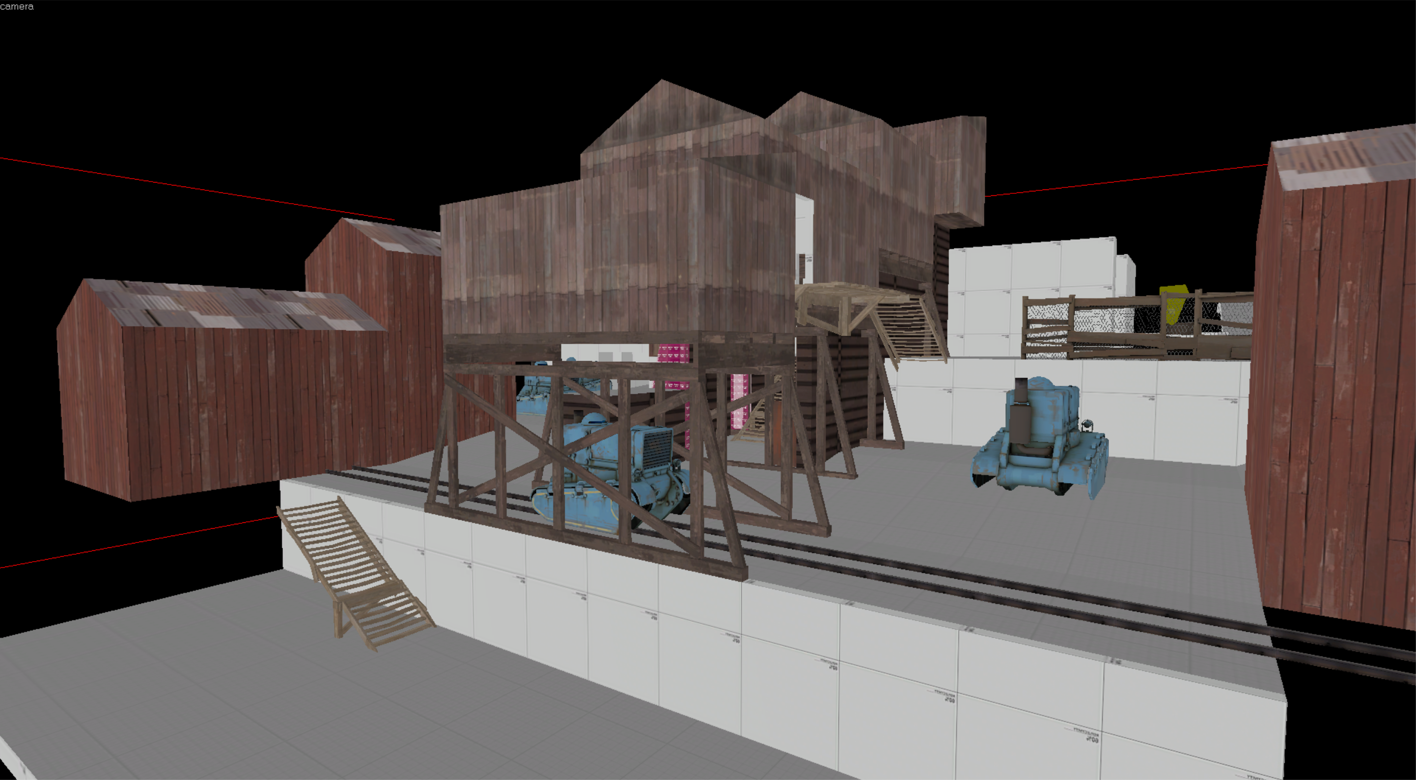 Redesign of the outdoor route. Robots being funneled down the train tracks was annoying to fight against, as was trying to fire weapons through the structure. The final design is less faithful to actual mining structures, but it makes the same general gestures and doesn't look out of place. The gap in the fence was outlined in wood for the final version so it was more immediately visible to players, as the grey thin fence tended to blend in with the valley vista behind it.