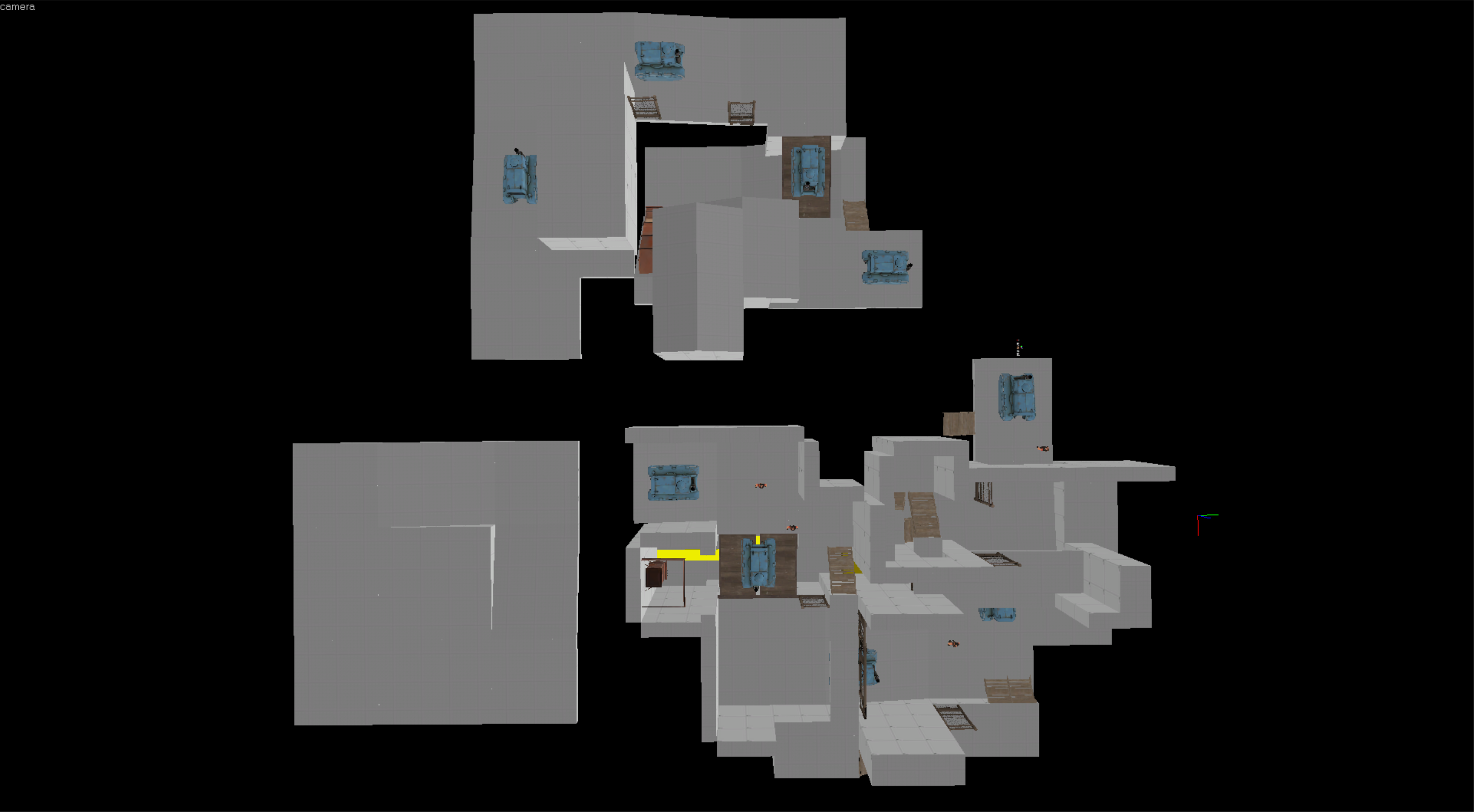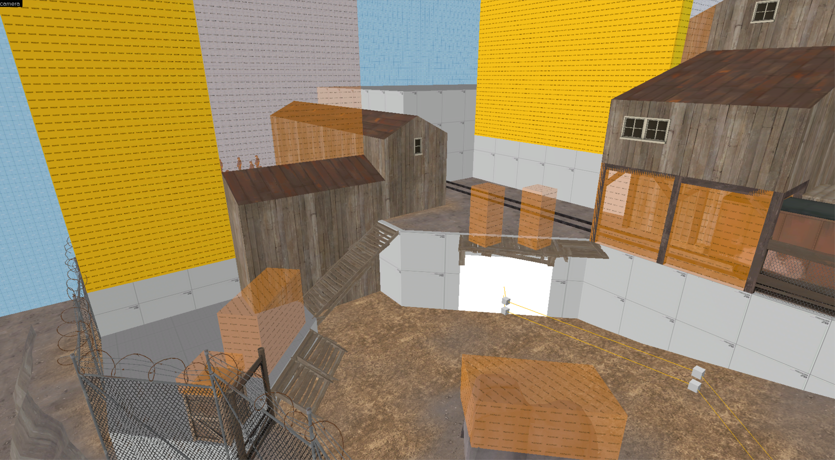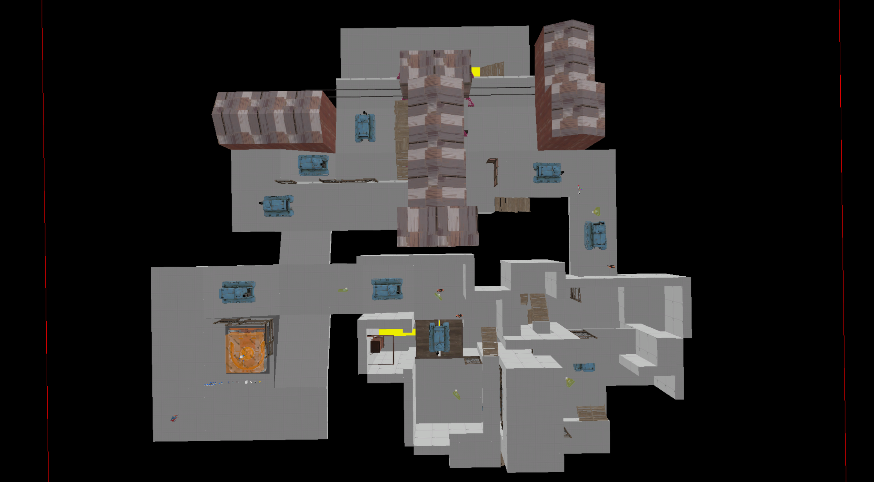 The figure 8 idea disappears and becomes the more simple form seen in the final map. Note how this simpler shape allows both routes to be more independent of one another, making the map easier to design. Early versions of this map actually have some connections between the two routes, but the final map has the routes completely separated, as players would only walk through the route the bots chose to attack on, and the connections went unused.